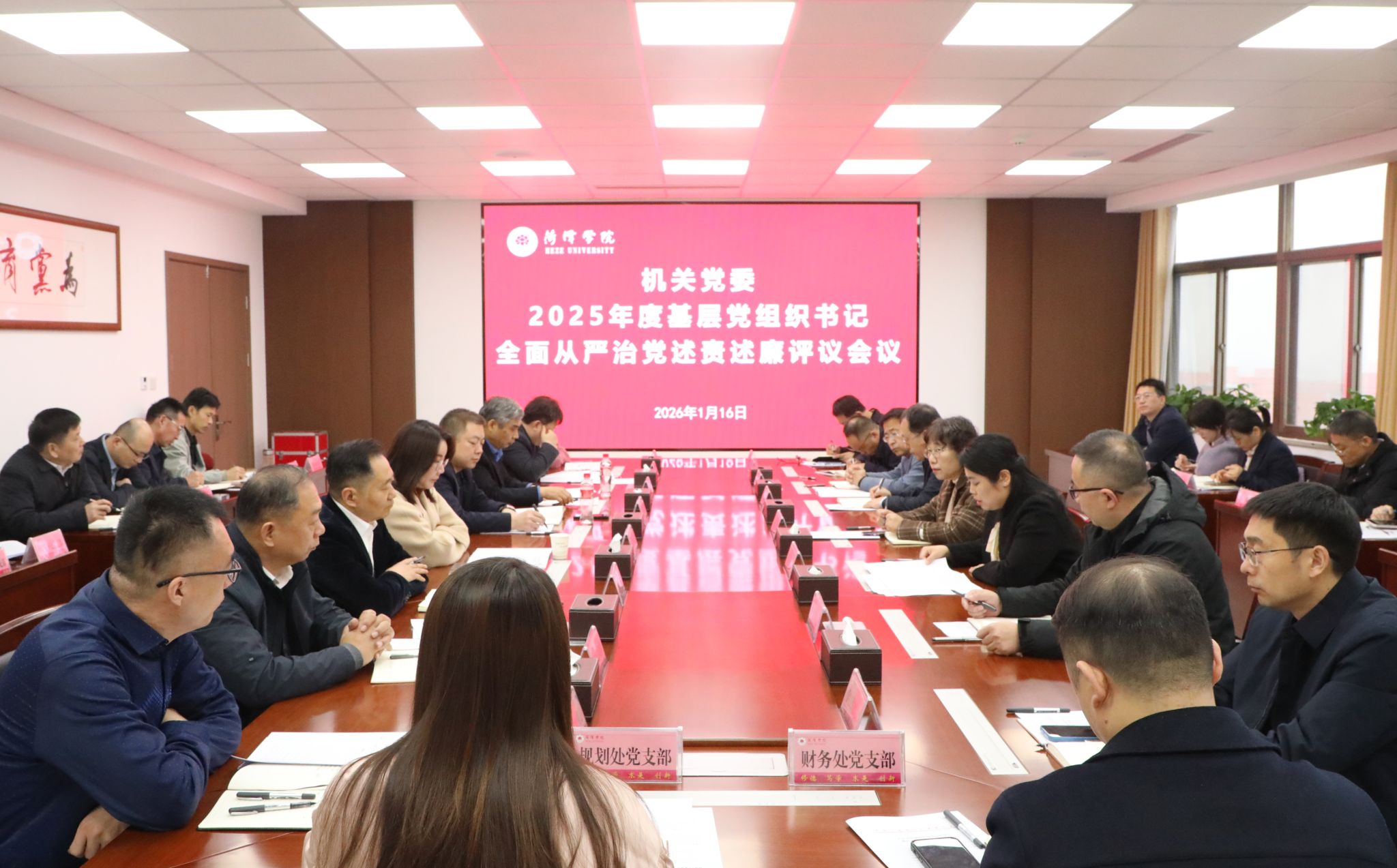 根据学校党委统一部署,2026年1月16日,机关党委在综合办公楼九楼会议室召开2025年度基层党组织书记全面从严治党述责述廉暨抓基层党建工作述职评议会议,学校党委委员、组织部部长潘峰出席会议,机关党委班子成员、机关各党总支、党支部书记参加会议,会议由机关党委书记吕杰主持。